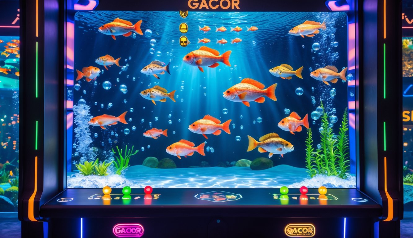 Orang-orang muda bermain permainan tembak ikan 3D di ruang bermain modern dengan mesin arcade berteknologi tinggi dan latar bawah laut berwarna-warni.